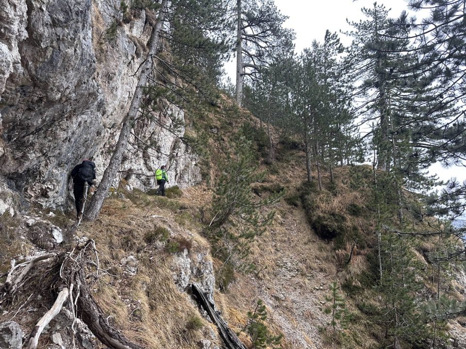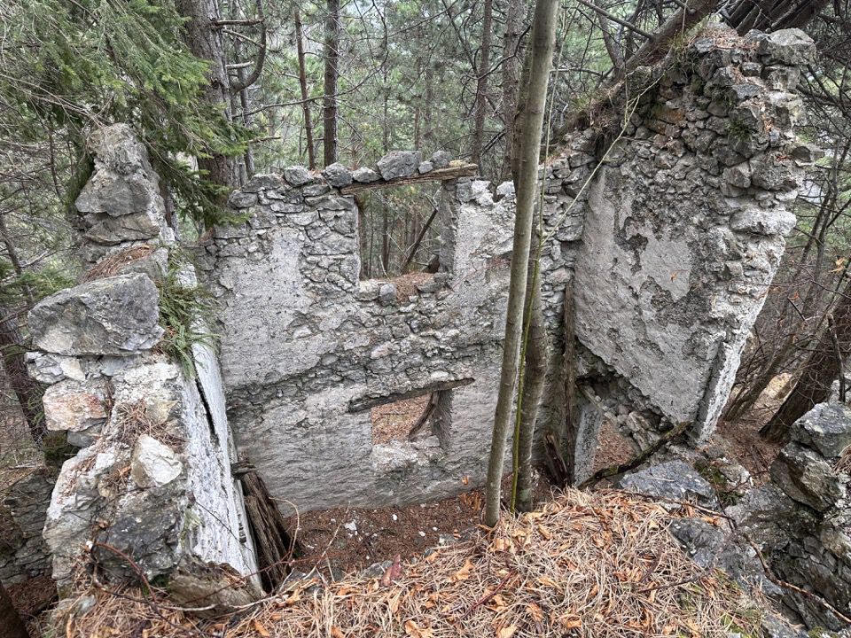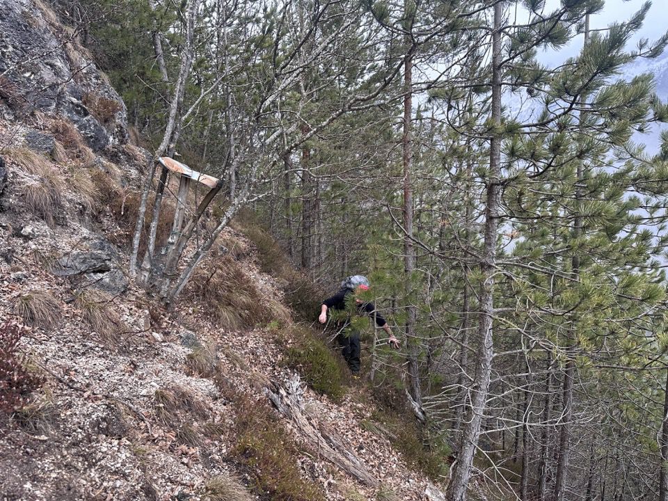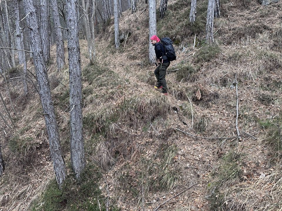 Con qualche titubanza iniziamo a salire per la costa sud che sovrasta lo stavolo Canine: terreno molto ripido e tagli spariti, ma ad una certa troviamo i resti di una salina di cacciatori. Noi ci si accontenta di poco... (ma non serve altro!).