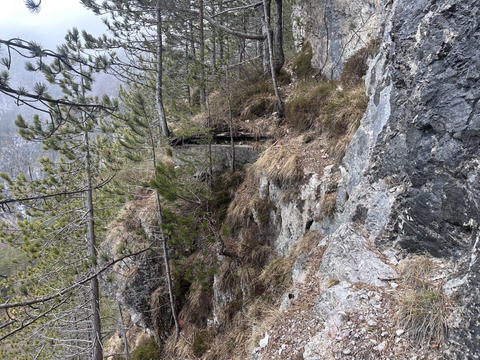 Seguiamo un tratto di cengia artificiale, peccato che essa si interrompa quasi subito (che ci fosse un ponticello un tempo?). Non si riesce a passare e stiamo già per girare i tacchi, quando noto un cavetto di ferro penzolante!