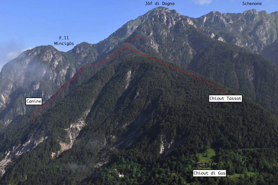Di là osservo compulsivamente il riu dai Balins con le pale boscose che s'immettono in esso; vedo pure l'uscita del mitico sentiero Pale di Chiout di Gus - f.lla Mincigos che percorsi un anno fa con Ilaria e Greta.