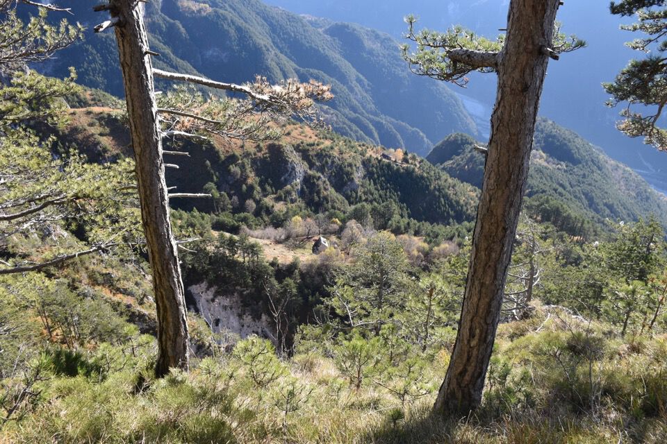 Ma eccoci dopo un po' a Forcje Diame: magnifica visione verso la valle del rio Simòn e il Cozarèl.