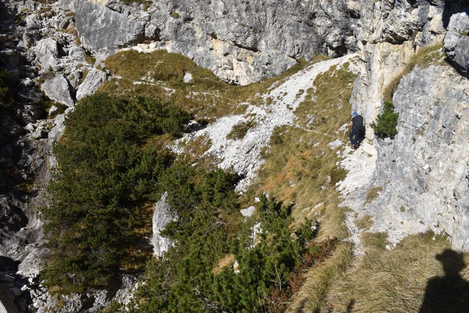 Alla fine della cengia vera e propria era meglio tirare su dritti verso Forcje Diame: noi abbiamo continuato seguendo la traccia più evidente, che pure concorda con quanto riportato in carta Tabacco, ma ha dei punti su loppe davvero esposte: sconsigliabile, come si suol dire.