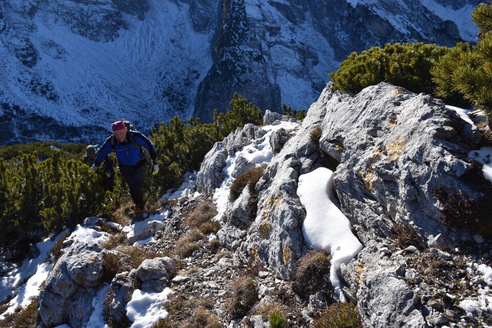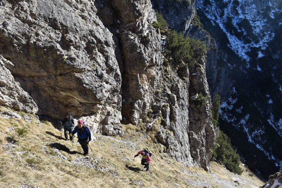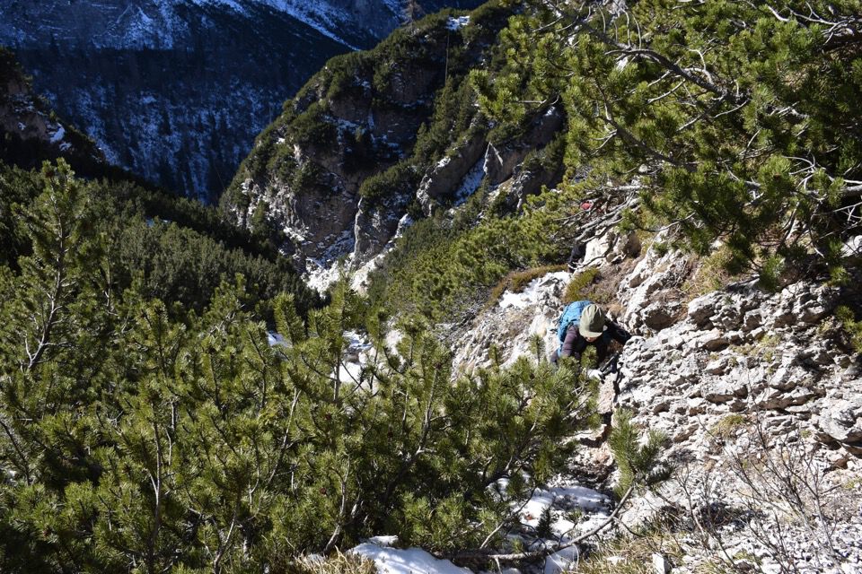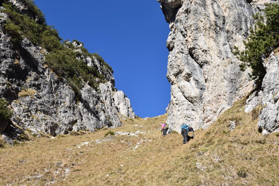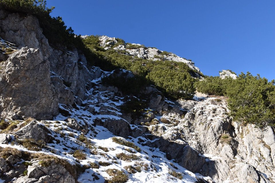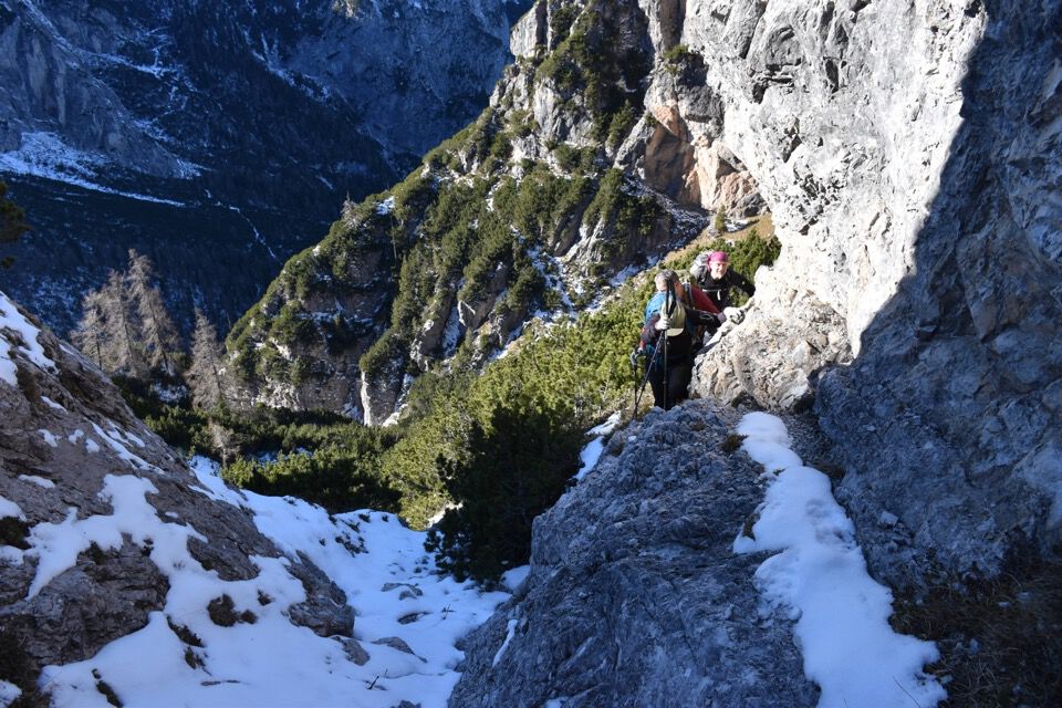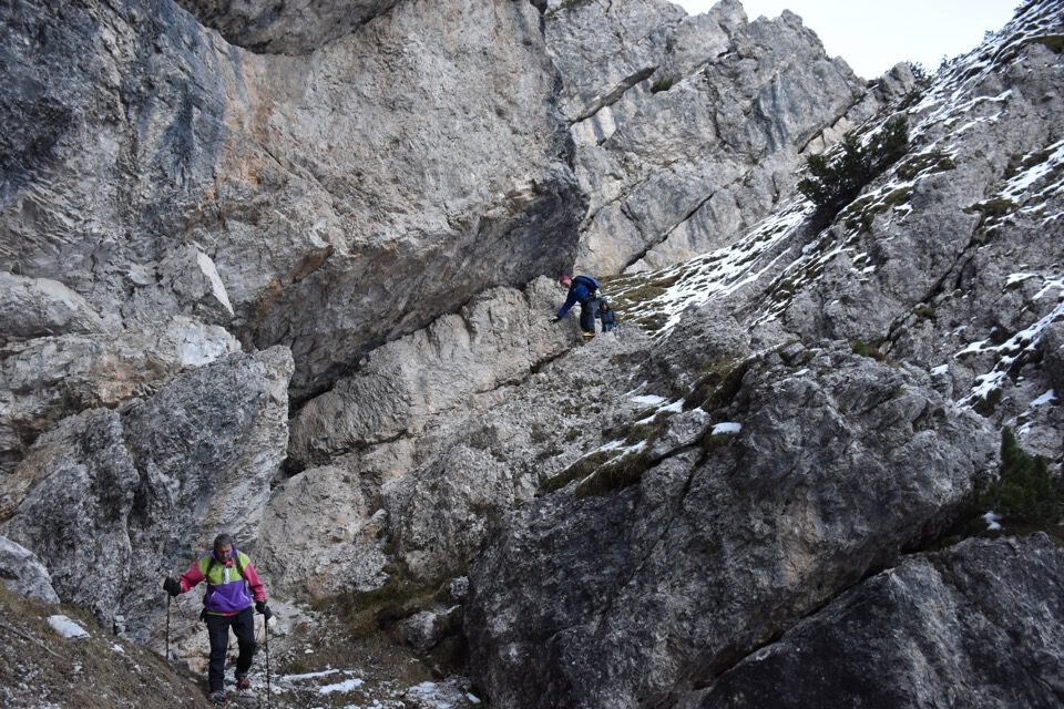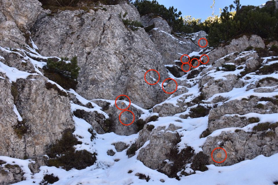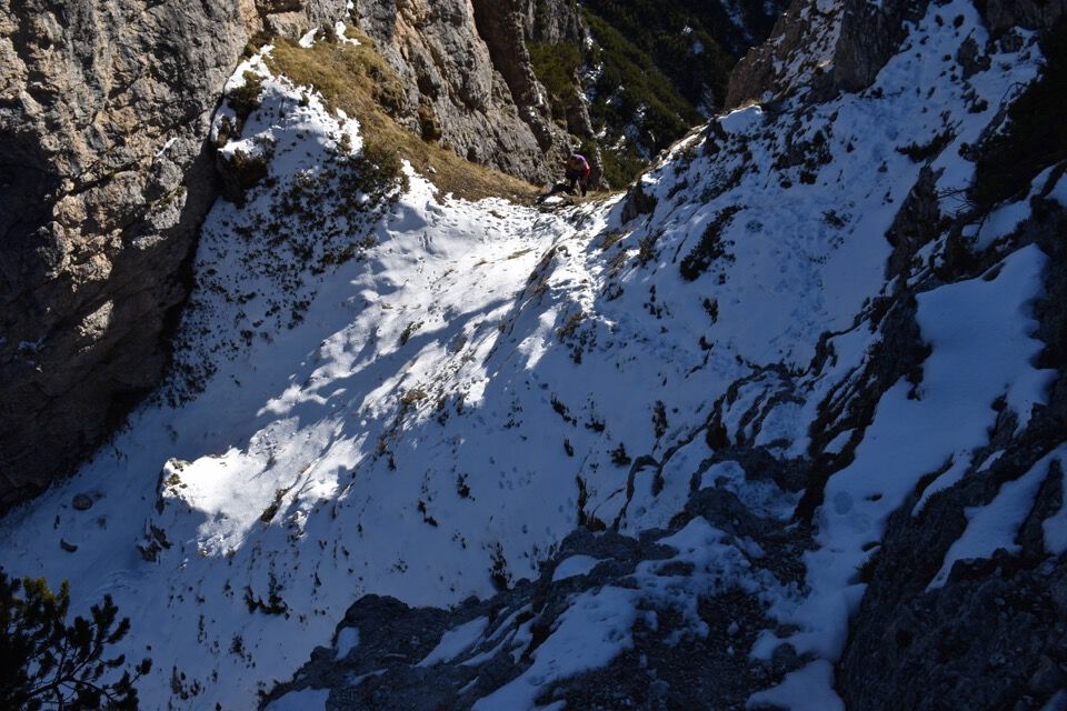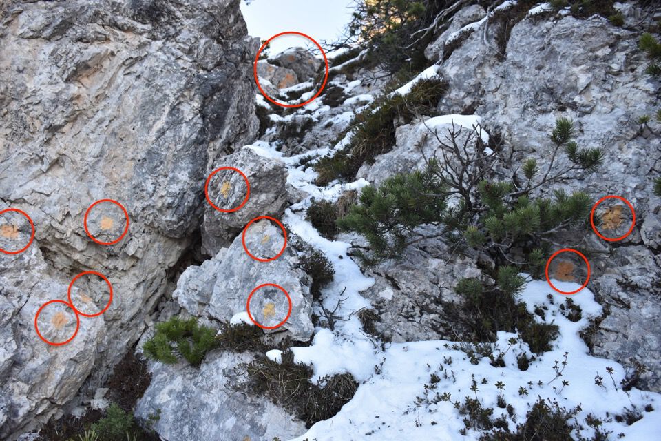 Chiaramente i bolli sono stati fatti nel punto sbagliato: la strada giusta è questa bella cengetta che un camoscio ci ha indicato con le sue impronte.